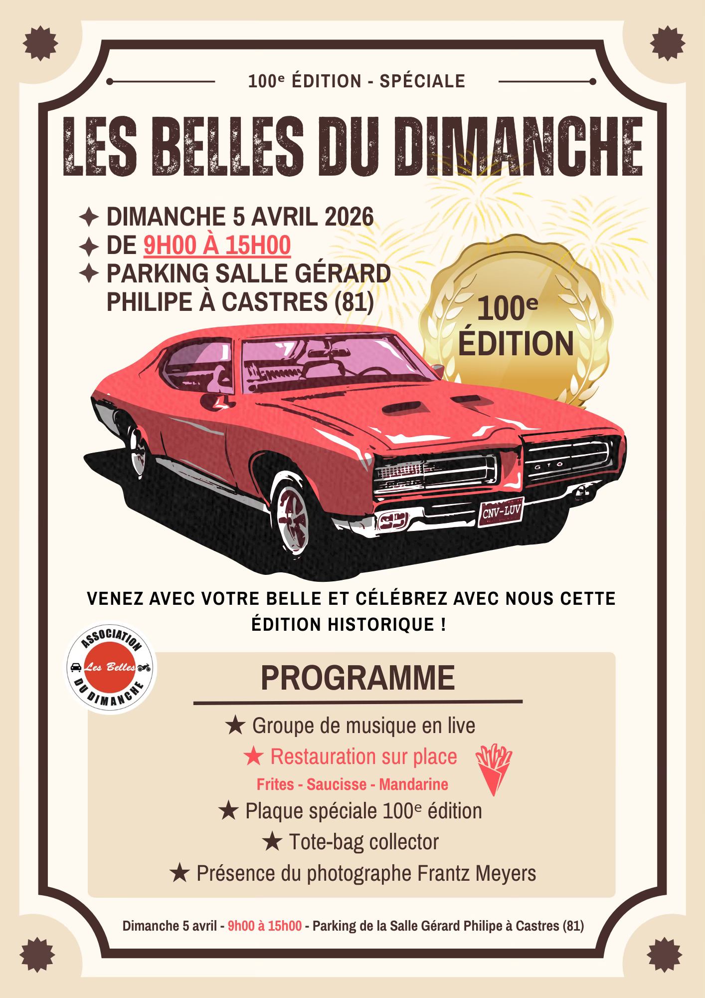 Ville de Castres Castres, FranceLes Belles du Dimanche fêtent leur 100ᵉ édition et vous donnent rendez-vous pour une matinée exceptionnelle !dimanche 5 avril 2026 de 9h00 à 15h00Parking de la Salle Gérard Philipe – Castres (81)Venez avec votre belle voiture et célébrer avec nous cette édition historique ! Au programme : Groupe de musique en live, restauration sur place...